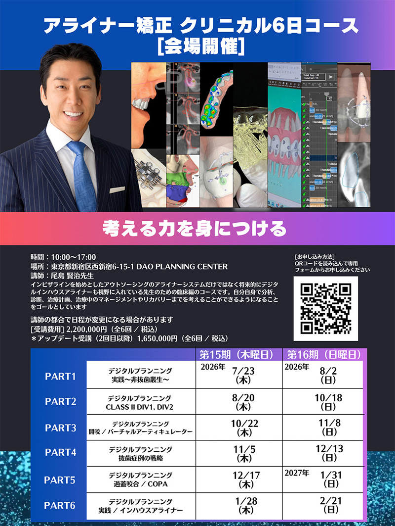 アライナー矯正 クリニカル6回コース[会場開催]LOCATION:DAO Planning Center(東京都新宿区) SCHEDULE:第15期[2026/7/23~2027/1/28]、第16期[2026/8/2~2027/2/21] SPEAKERS:尾島 賢治 |