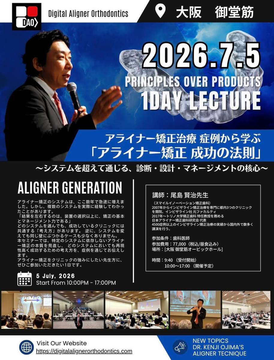 アライナー矯正治療の成功の法則LOCATION:大阪 御堂筋オービックホール SCHEDULE:2026/7/5 SPEAKERS:尾島 賢治 |
