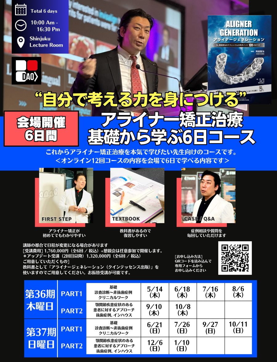 アライナー矯正治療 基礎から学ぶ6日コース[会場開催] *初回受講:1,760,000円(税込) *リピート受講:1,320,000円(税込) |